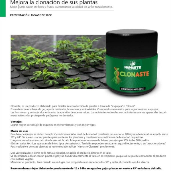 Clonaste es un producto pensado y diseñado para hacer más fácil y eficiente el proceso de clonación o esquejado de plantas. Elaborado en forma de gel, para que sea más fácil su aplicación. Contiene distintas hormonas y reguladores de crecimiento; que facilita y estimula la formación de nuevas raíces. También aporta aminoacidos, vitaminas y nutrientes.