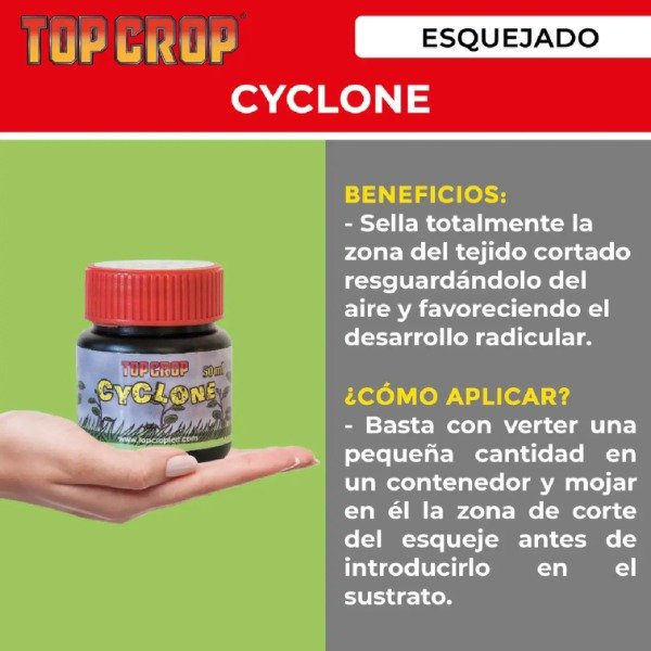 Cyclone de Top Crop es un gel destinado a la producción de esquejes cuya composición produce la aparición de raíces derivado de la estimulación hormonal que produce en los plantines.