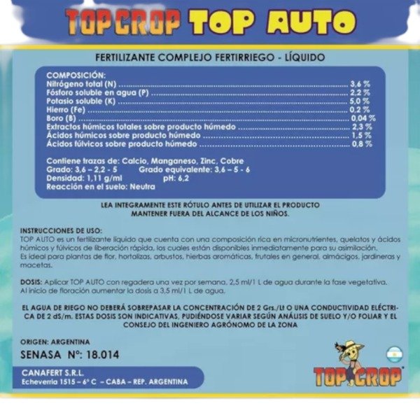 Top Auto es un fertilizante líquido NPK con micronutrientes quelatos y ácidos húmicos y fúlvicos de alta solubilidad formulado especialmente para plantas autoflorecientes.