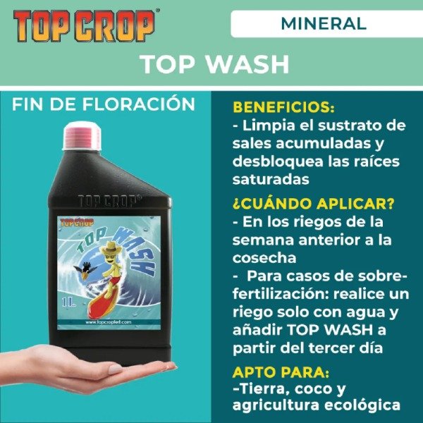 Top Wash es un aditivo que actúa sobre el medio de cultivo limpiando o eliminando el exceso de sales del sustrato.
